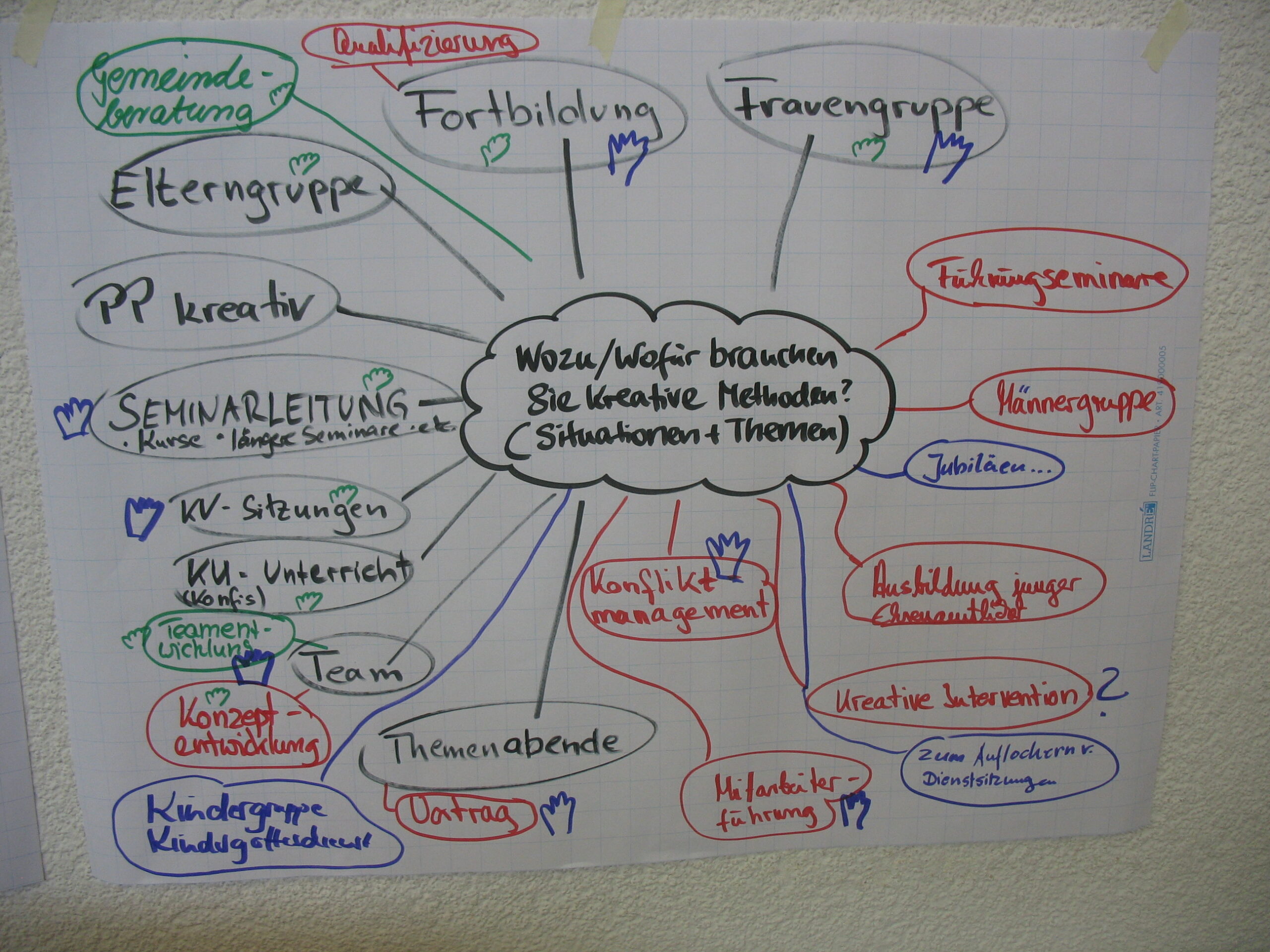 Zum Einstieg in ein Seminar hatten wir 4 Flipcharts auf 4 verschiedenen Tischen liegen oder an 4 verschiedene Pinnwände gehängt. Im Querformat, weil man so besser ein Mind Map gestalten kann.