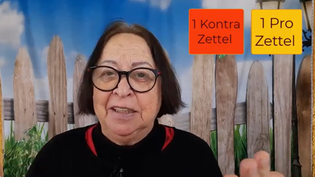 3 – Lege nun den 1. Kontra-Zettel neben den 1. Pro-Zettel und schau einfach, ob dir durch diese Kombination noch weitere Ideen kommen.