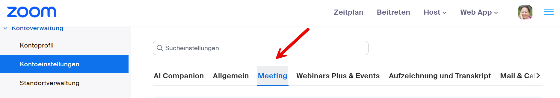 ADMIN, dort unter Kontoverwaltung → Kontoeinstellungen, und dann erscheinen oben diverse Reiter und du klickst auf Meeting.