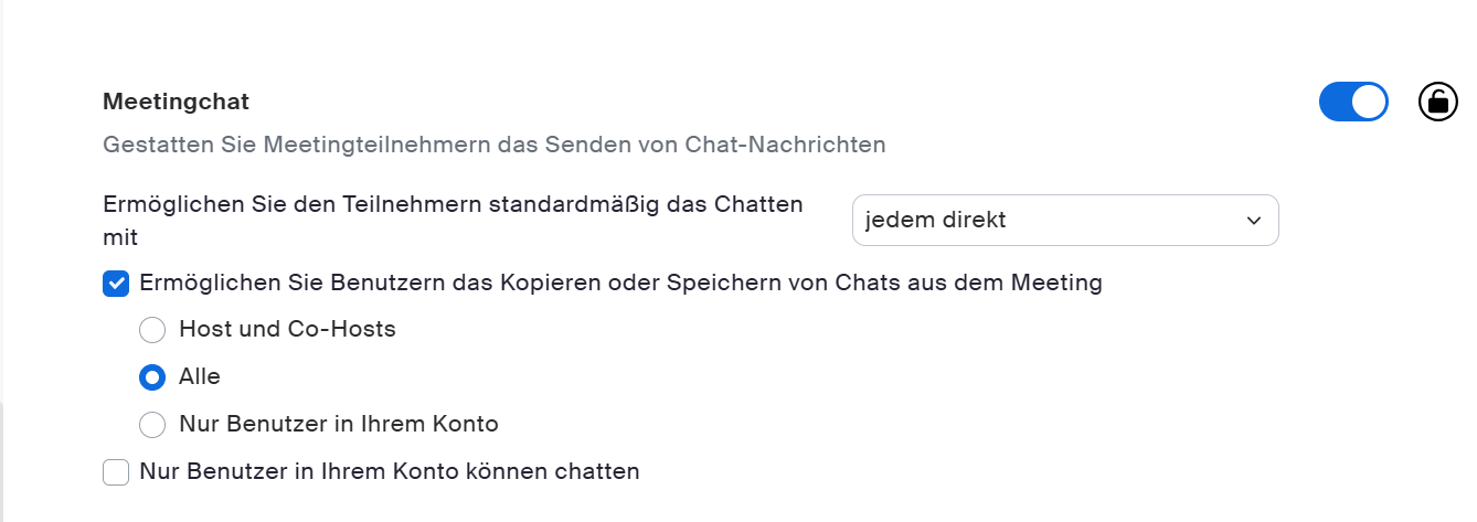 Als Host kannst du auf dem Dashboard von Zoom einige grundlegende Einstellungen zum Chat vornehmen.